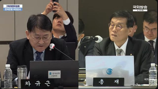 20일 서울 중구 한은 본부에서 열린 국정감사에서 이창용 한은 총재는 차규근 조국혁신당 의원 질의에 대해 최 전부총리로부터 쪽지 정독 여부는 들은 바 없다고 했다.