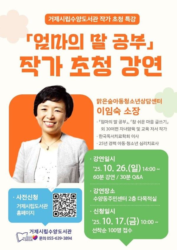 거제시립수양도서관은 26일 오후 2시, '엄마의 말 공부'로 잘 알려진 이임숙 작가를 초청해 “부모와 아이를 이어주는 공감과 존중의 대화법”을 주제로 한 강연을 연다.