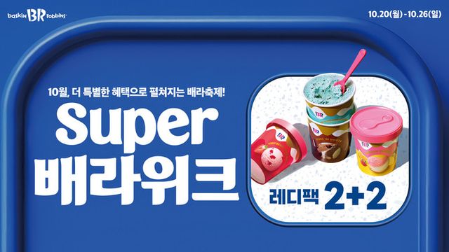배라위크는 매월 셋째 주 진행되는 정기 행사로, 배스킨라빈스 제품을 특별가로 즐길 수 있도록 마련됐다. 이번 슈퍼 배라위크는 오는 26일까지 진행되며, 레디팩 2개 구매 시 2개를 추가 증정하는 '레디팩 2+2' 혜택을 제공한다. 플레이버는 교차 선택이 가능하다.