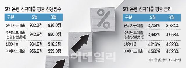은행은 상환능력이 더 좋은 차주에 대해 금리를 낮춰준다. 은행으로서는 대출 부실에 따른 신용리스크(위험)와 관리비용 부담이 그만큼 감소하기 때문이다. 하지만 차주의 신용점수가 높아졌는데도 대출금리가 동반 상승했다. 6·27대책 이전인 5월 중 은행이 신규 취급한 전세자금대출 금리는 연 3.704%에서 8월 3.734%로 올랐다. 주택담보대출 금리(분할상환방식) 금리는 같은 기간 연 3.942%에서 4.058%로, 신용대출 금리는 연 4.216%에서 4.328%로 각각 뛰었다.