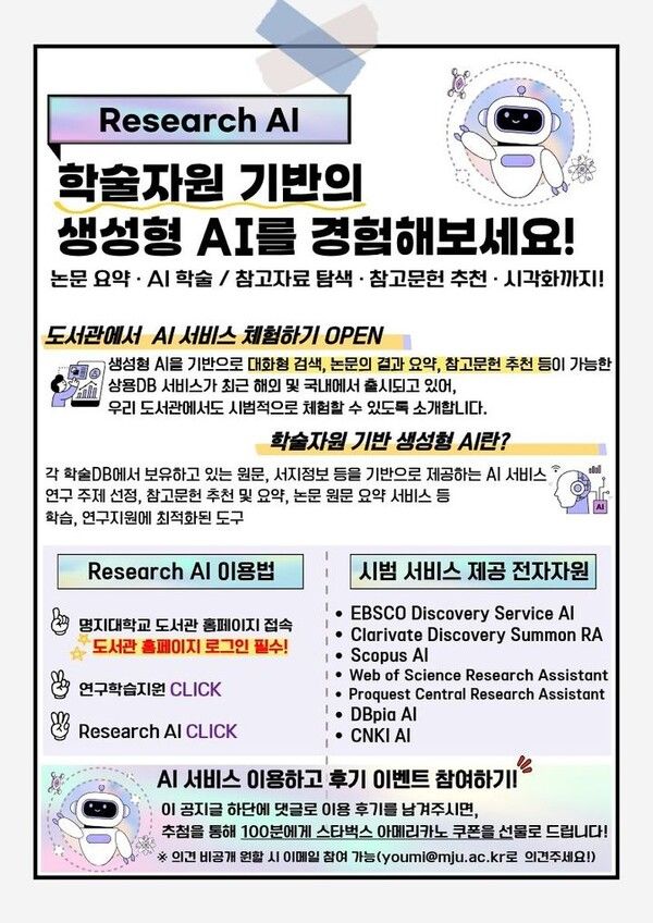 명지대는 지난달 1일부터 11월30일까지 도서관 홈페이지를 통해 '연구용 인공지능(Research AI) 무료 시범 서비스'를 운영한다.