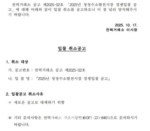 20일 관련업계에 따르면 청정수소발전입찰 주관기관인 전력거래소는 지난 17일 CHPS 경쟁 입찰을 취소한다고 공지했다. 취소 사유는 ‘새로운 공고로 대체하기 위함’이다.