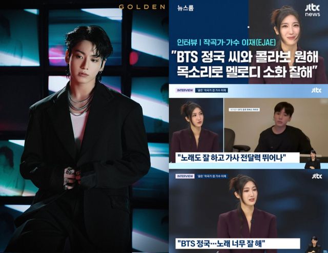 19일 방송된 JTBC ‘뉴스룸’ 초대석에 출연한 ‘케데헌’ OST ‘골든’의 작곡가 겸 가창자 이재(EJAE)는 직접 정국을 언급하며 “정국 씨, 한 번 컬래버 해 주세요”라고 공개 러브콜을 보냈다.