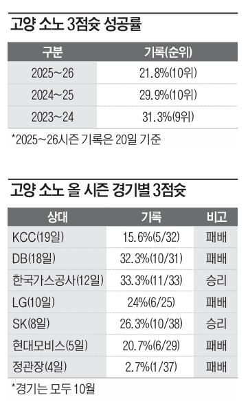 15.6%. 지난 19일 열린 2025~26 LG전자 프로농구 정규리그 부산 KCC 이지스와의 홈 경기에서 기록한 고양 소노 스카이거너스의 팀 3점슛 성공률이다. 이날 소노는 3점슛 32개를 시도해서 5개만 집어넣었다.