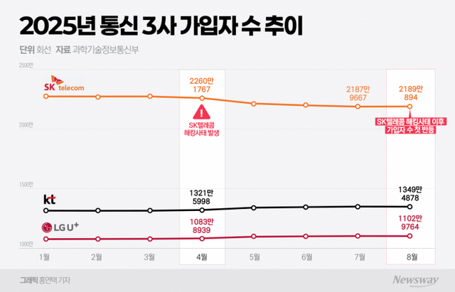 SK텔레콤의 시장점유율이 오름세를 그린 것은 올해 3월(2310만4423개) 이후 5개월 만이다. SK텔레콤은 지난 4월 발생한 유심 해킹 사태로 가입자 수가 지속 감소해 왔다.