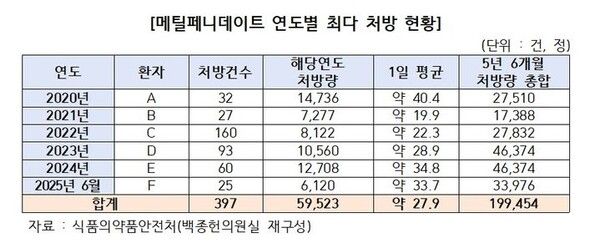 지난 2020년부터 올해 6월까지 연도별 최다 처방 1위 환자 6명의 해당연도 처방량을 합산하면 5만9523정이다. 각자 5년 6개월동안 처방받은 총량을 합하면 19만9454정이다.