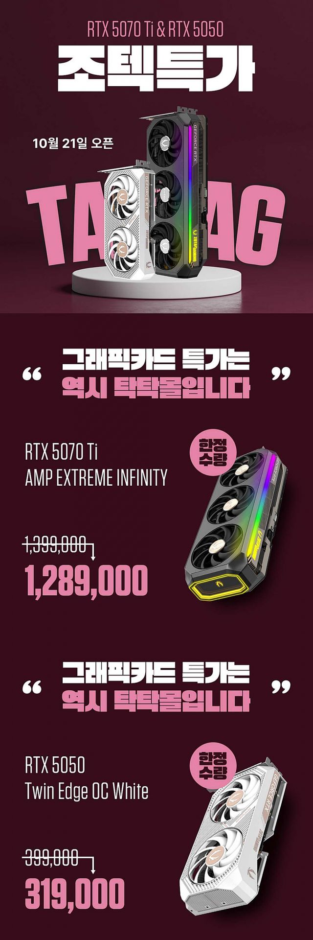 조텍 그래픽카드 특가 이벤트는 조텍 공식 쇼핑몰 탁탁몰(www.tagtag.co.kr)에서 10월 21일 오전 11시부터 10월 23일까지, 또는 재고 소진 시까지 진행된다. ‘ZOTAC GAMING GeForce RTX 5070 Ti AMP Extreme Infinity’는 1,289,000원, ‘ZOTAC GAMING GeForce RTX 5050 Twin Edge OC White’는 319,000원에 구매할 수 있다. 자세한 내용은 조텍 공식몰 내 특가 페이지(https://www.tagtag.co.kr/product/list.html?cate_no=372)에서 확인할 수 있다.