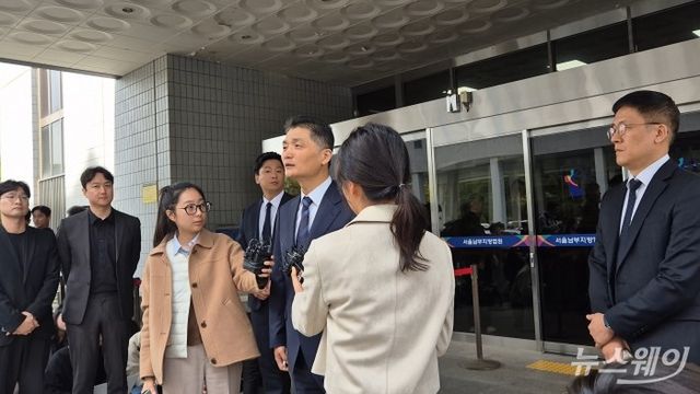 김범수 카카오 창업자가 21일 오전 서울남부지방법원에서 열린 자본시장법 위반 혐의 1심 무죄 선고 이후 기자들과 만나 발언하고 있다. 사진=유선희 기자