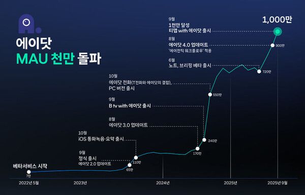 뉴시스 보도에 따르면, 이는 에이닷 앱·웹(450만명), 전화·B tv·티맵 등 다른 서비스 내 에이닷 기능 이용자(550만명)를 합산한 수치다. 지난해 10월 MAU 550만명을 기록한 지 1년 만에 2배 가까이 성장했다.