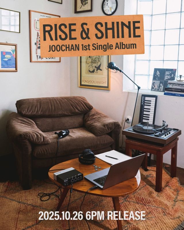 공개된 포스터는 LP 플레이어와 건반, 헤드폰, 마이크 등 다양한 장비가 놓인 방의 모습을 비추고 있어 단번에 시선을 사로잡았다. 쇼파와 테이블, 러그 등 차분한 브라운 톤으로 꾸며진 공간은 가을 분위기를 물씬 자아냈다. 여기에 곡명 ‘라이즈 앤 샤인’, 발매일시인 ‘2025.10.26’, ‘6PM’ 등이 함께 새겨져 있어 기대감을 더욱 상승시켰다.
