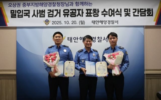 이날 중부해경청장은 밀입국 사범 검거에 공을 세운 태안해경서 수사과 박민호 경사와 206정 이재희 경장에게 표창을 수여하고, 직원들과의 간담회를 통해 현장 애로사항과 치안 대응 방안을 청취했다.