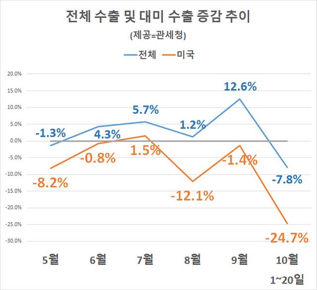미국 고관세 정책의 여파가 갈수록 커지는 모습이다. 이달 초 추석 연휴에 따른 조업일수 감소로 중국(65억 6000만달러·9.2%↓)과 베트남(28억 7000만달러·10.0%↓) 등 다른 지역 수출도 줄었으나 그중에서도 미국의 낙폭이 가장 컸다.