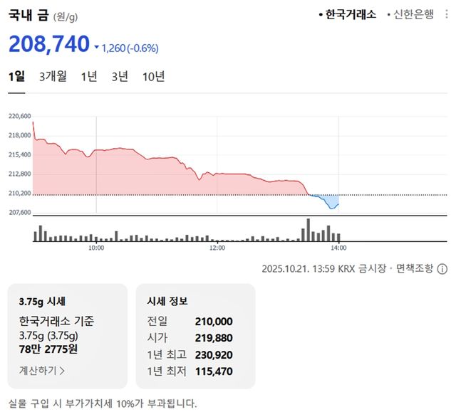 국내 금시세(금값)가 21일(이하 한국 시각) 오후 하락세(전 거래일 대비)를 보이고 있다.
