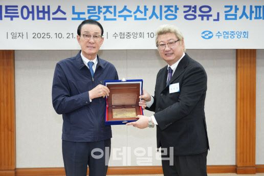 노량진수산시장 상인회 측은 이날 서울시티투어버스 노량진수산시장 경유 노선 확정에 기여한 노동진 수협 회장에게 고마움을 표시한 뒤 감사패를 전달했다.