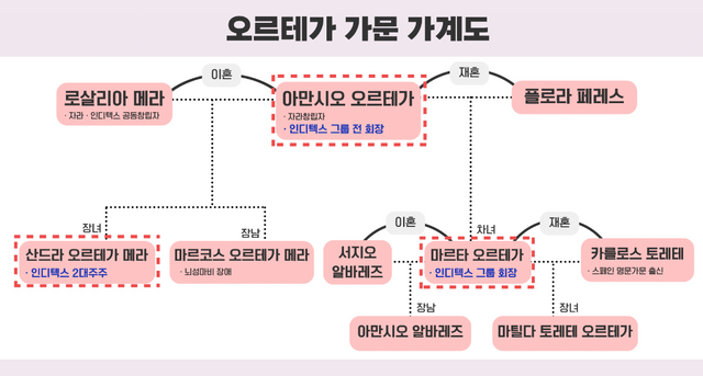 최근 패션 브랜드 '자라'로 더욱 유명한 스페인 대표 패션기업 '인디텍스그룹'의 경영권 분쟁 가능성이 고개를 들고 있다. 그룹을 소유한 '오르테가(Ortega)' 가문 내부의 내홍 가능성 때문이다. 주변의 예상을 뒤엎고 창업주 둘째 부인의 자녀에게 경영권이 넘어가면서 첫째 부인 자녀와의 다툼 가능성이 높게 점쳐지고 있는 것이다. 오르테가 가문이 소유한 인디텍스(Inditex) 그룹은 아르노(Arnault) 가문의 LVMH그룹에 이어 유럽 재계 서열 2위에 올라 있다. 주력 기업인 인디텍스의 시가총액은 약 1487억달러(약 211조원)에 달하며 그룹을 소유한 오르테가 가문의 재산 규모는 약 1290억달러(약 185조원) 수준으로 알려졌다.