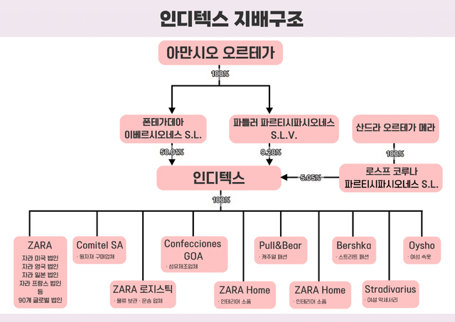 현재 인디텍스는 자라를 비롯해 △풀앤베어(Pull&Bear) △마시모 두티(Massimo Dutti) △자라홈(Zara Home)△ 벌쉬카(Bershka) 등의 패션 자회사를 소유하고 있다. 또 △원자재 구매업체 코미텔(Comitel) △섬유제조사 콘펙시오네스 고아 △물류회사 자라 로지스틱(Zara Logistic) 등의 최대주주에 올라 있다. 그룹 자체적으로 생산부터 유통, 판매 등의 시스템을 구축하고 있는 셈이다.