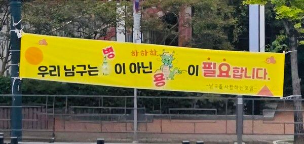 현수막 문구 중 '병'과 '용' 주변에는 각기 소주병과 용 캐리커처 그림도 함께 담겼다. 웃음소리 의성어인 '하하하'라는 문구와 함께 실체를 알 수 없는 '남구를 사랑하는 모임'이 적혔다.