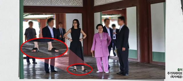 해당 사진에서 김 여사는 검은 민소매 원피스 차림에 맨발로 슬리퍼를 신은 채 허리에 손을 얹고 서 있다. 그 옆에 보라색 정장 차림의 이 전 위원장은 흰 양말만 신고 서 있다.