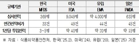 연간 신약허가 1건당 투입인력은 식약처가 3~5명인 데 비해 미국은 약 40명, 유럽은 약 20명, 일본은 약 15명이었다.