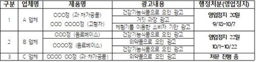 B업체는 의약품 및 건강기능식품 오인 광고로 약 1년간 총 51.7억원 어치의 식품을 판매했으며, 10월 1일부터 10월 22일까지 총 22일간의 영업정지 처분을 받았다.