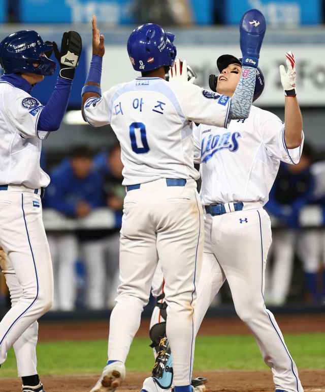 (대구=연합뉴스) 윤동진 기자 = 21일 대구삼성라이온즈파크에서 열린 2025 KBO 포스트시즌 플레이오프 한화 이글스 대 삼성 라이온즈 3차전. 4회 말 1사 1,2루 때 삼성 김영웅이 3점 홈런을 친 후 동료들과 함께 기뻐하고 있다. 2025.10.21