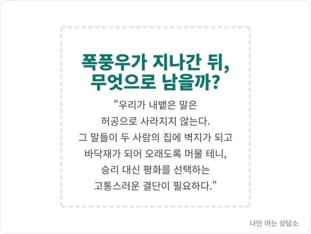 싸움의 목적이 상대를 이기는 것이 아니라, 문제를 해결하고 다시 사랑하기 위함이라면, 우리는 다른 언어를 선택해야 한다. 이 말들은 당신의 자존심을 꺾는 패배의 언어가 아니라, 관계를 지키는 성숙한 승리의 언어다.
