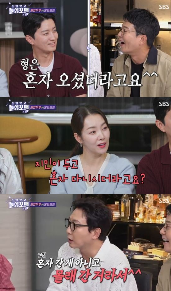 이에 소이현은 김준호를 바라보며 "지민이 두고 혼자 오셨더라고요? 신혼인데 혼자 다니시더라. 저희는 같이 다닌다"고 했고, 탁재훈은 "그건 혼자 간 것이 아니라 몰래간 것"이라고 폭로해 웃음을 자아냈다.