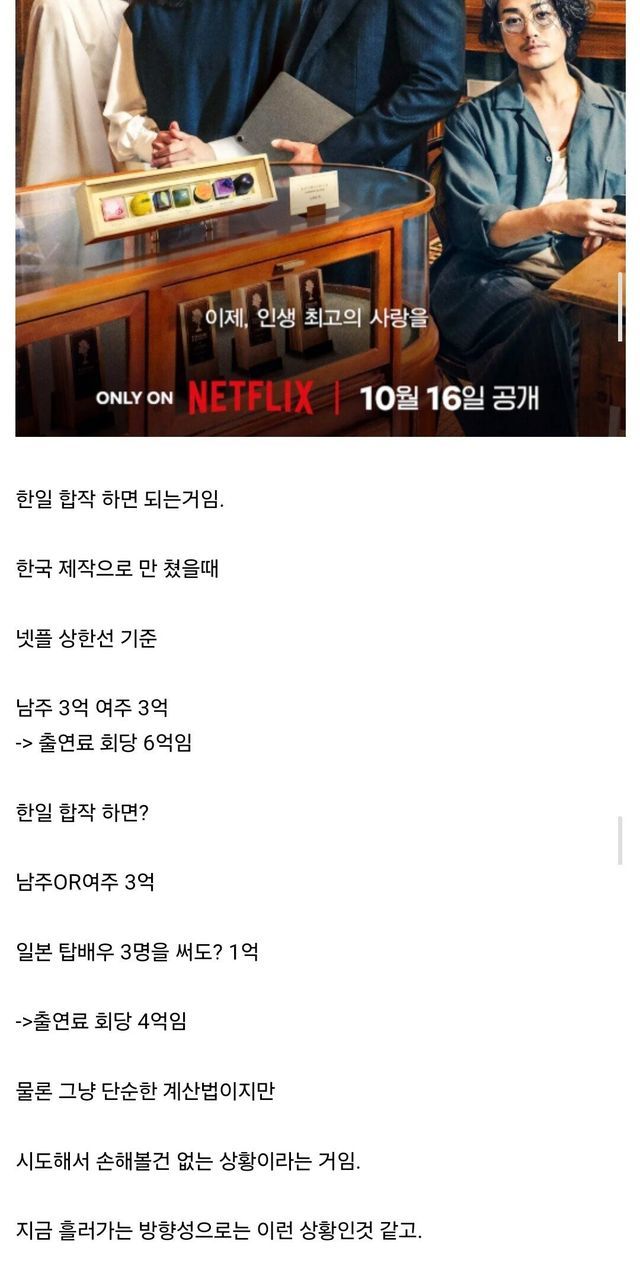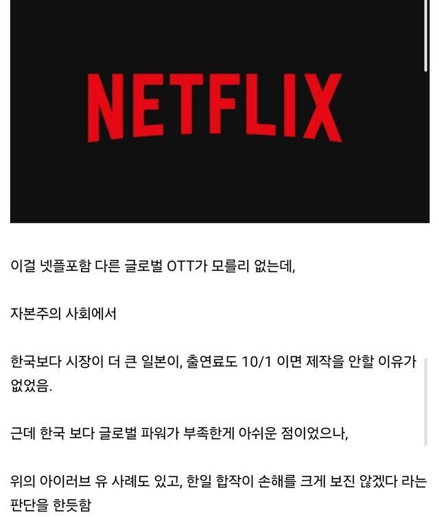 글로벌 OTT에서는 제작을 싸게 해서 좋고, 컨트롤도 어느정도 가능하다고 생각하니 한류라는 이미지에 일본 엔터사업을 키우는 움직임을 보이고 있어 한국 콘텐츠의 시장파이도 줄어들까봐 걱정중