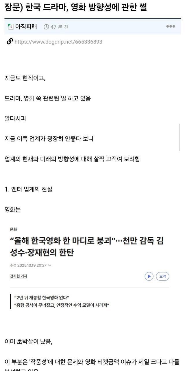 근데 그 베테랑들이 제작한다고 작품이 무조건 대박나는것도 아니라 제작 환경은 더욱 악화되니 제작비는 적으면서 효율을 뽑을수 있는 자극적인 숏폼 제작이 활발해지면서 산업의 다양성과 창의성이 점차 사라지고 있음