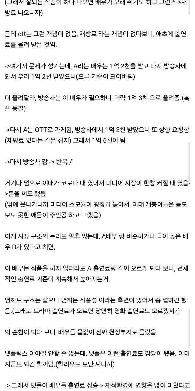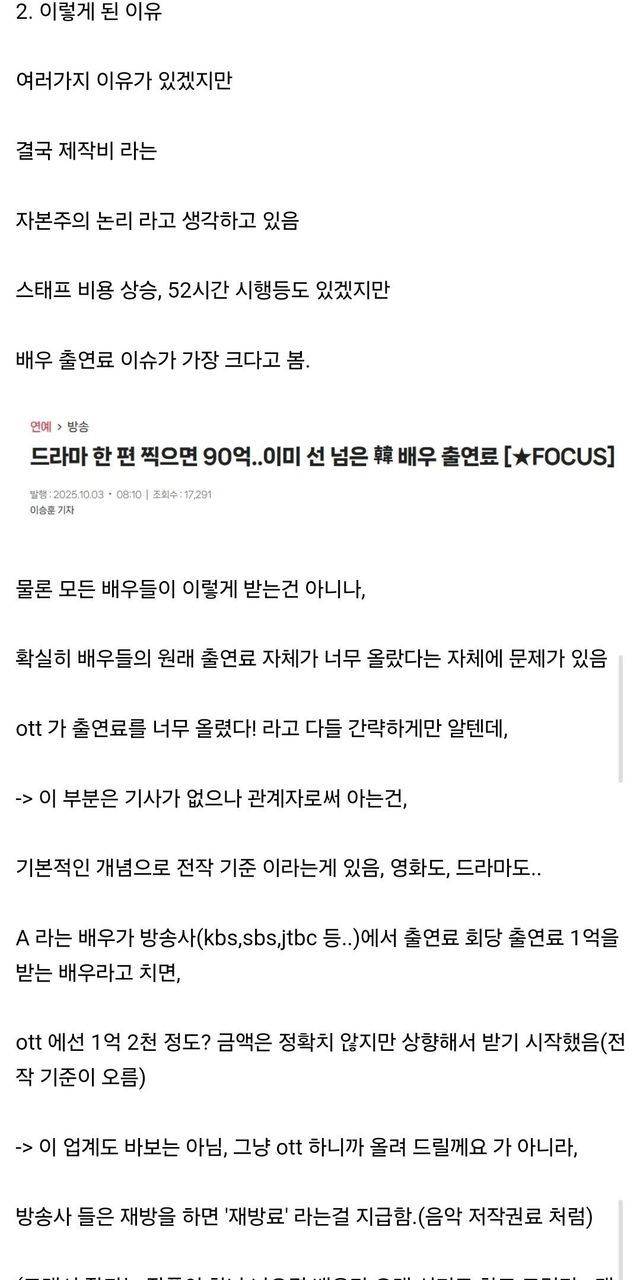 2. 드라마도 제작비 폭등과 편성 축소로 위기 국면에 진입, 특히 OTT의 등장과 성장으로 인한 배우 출연료 급등이 가장 큰 부담으로 작용하며 중간 규모의 작품 제작이 점점 어려워지고 있음.
