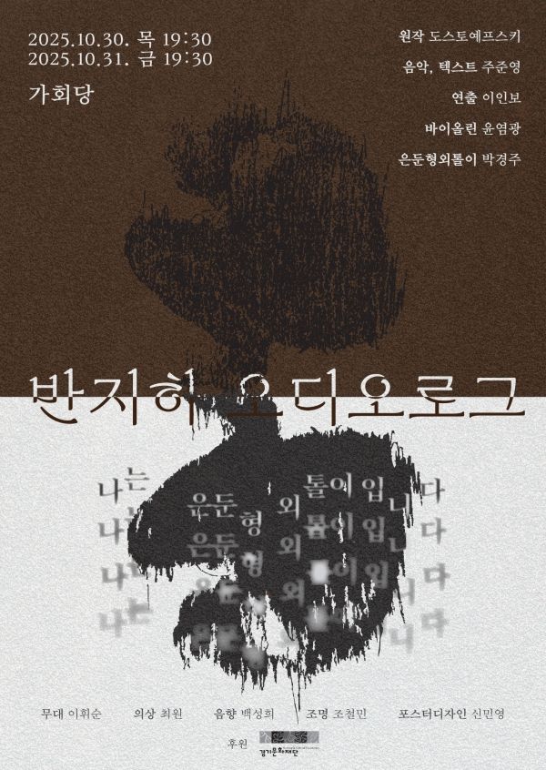 경기도와 경기문화재단이 지원하는 2025 경기예술지원 기초예술창작지원 사업을 통해 제작돈 '반지하 오디오로그-나는 은둔형 외톨이입니다’가 오는 10월 30일(목)과 31일(금), 수원 가회당(경기도 수원시 팔달구 행궁로 33)에서 공연된다.