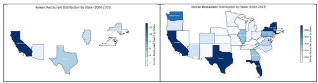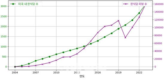 연구 결과에 따르면 미국 내 한식당 수는 2000년대 중반부터 증가세를 보였고, 2015년 이후 폭발적으로 늘었다. 2015년은 BTS가 처음으로 빌보드 200 차트에 진입하고, 넷플릭스에서 한국 드라마가 본격적으로 스트리밍되기 시작한 시기다. 한류의 확산이 소비행동으로 전이되며 한식당 시장을 확대시킨 시점이다.