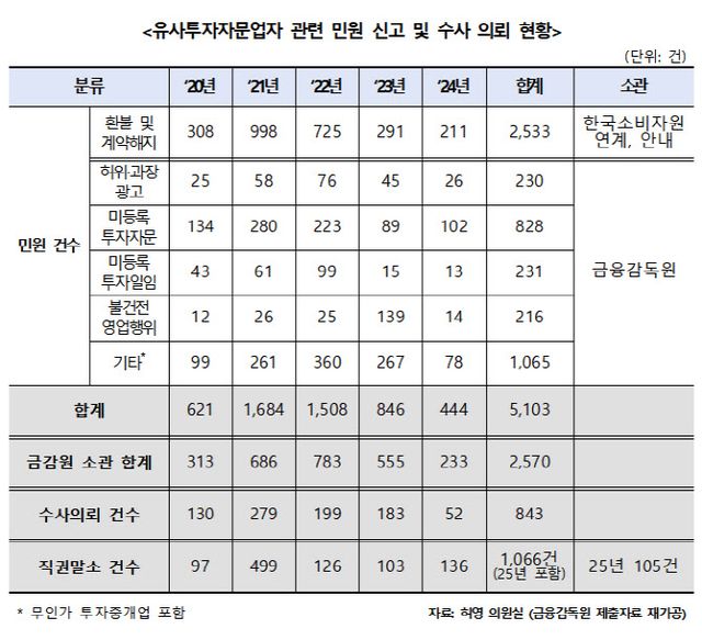 22일 국회 정무위원회 소속 허영 더불어민주당 의원이 금융감독원으로부터 지난 5년간(2020~2024년) 접수된 유사투자자문업 관련 민원 및 수사의뢰 현황을 제출받아 분석한 결과, 총 5103건의 민원이 접수되고 이 중 843건이 불법행위로 수사 의뢰된 것으로 나타났다.