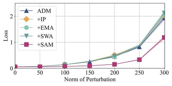 평탄한 최소점을 찾는 학습 알고리즘 중에서는 SAM(Sharpness-Aware Minimization)이 가장 효과적인 것으로 드러났다. SAM을 적용한 확산모델은 짧은 생성 과정에서도 오차 누적의 영향을 덜 받았고, 소형 기기 이전을 위한 압축(양자화)에서도 품질 저하가 작았다. 특히 기존 모델보다 7배 강한 적대적 공격에도 성능을 유지하며 확산모델의 강건성을 크게 높였다.