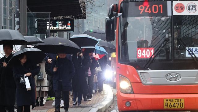 서울 중구 '국가인권위.안중근활동터' 정류장에서 경기도서 승차한 광역버스 이용객들이 하차해 보행 신호를 기다리고 있다. / 연합뉴스