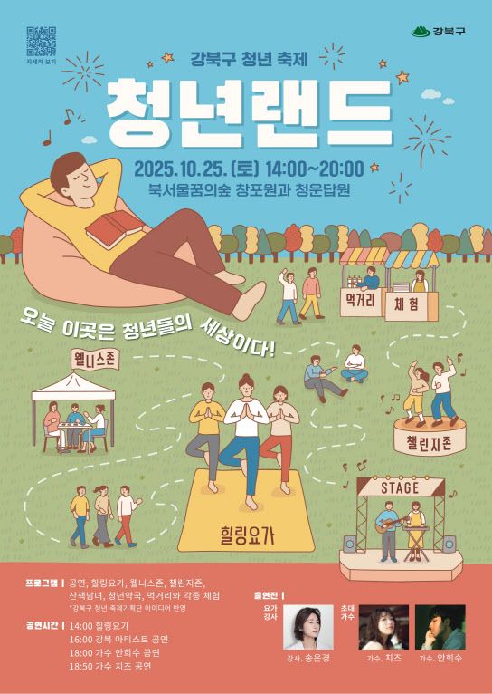 강북구청은 오는 25일 오후 2시부터 8시까지 북서울꿈의숲에서 ‘2025 강북구 청년축제-청년랜드’를 연다고 22일 밝혔다. 이번 축제는 ‘쉼과 나다움’을 주제로 청년들이 바쁜 일상에서 벗어나 자신을 되돌아보고 새로운 경험을 할 수 있도록 기획됐다.