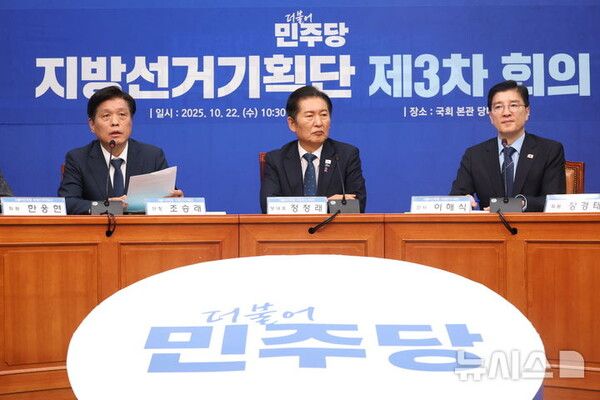 정청래 더불어민주당 대표는 이날 회의에 참석해 "내년 지방선거는 매우 중요한 선거다. 12·3 비상계엄 내란 사태를 일으킨 헌법 파괴 세력과 응원봉을 들고 빛의 혁명을 이뤄낸 헌법 수호 세력이 다시 맞붙는 선거"라며 "우리 당이 확실히 승리해야 한다"고 했다.