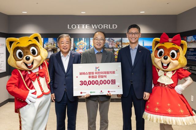 롯데월드가 하남 보바스병원 어린이재활센터의 취약계층 환아 치료비로 쓰일 기부금 3000만원을 전달했다고 22일 밝혔다. 이번 전달식에는 권오상 롯데월드 대표이사, 김천주 롯데의료재단 이사장, 윤연중 하남 보바스병원 병원장 등 주요 관계자들이 참석했다.
