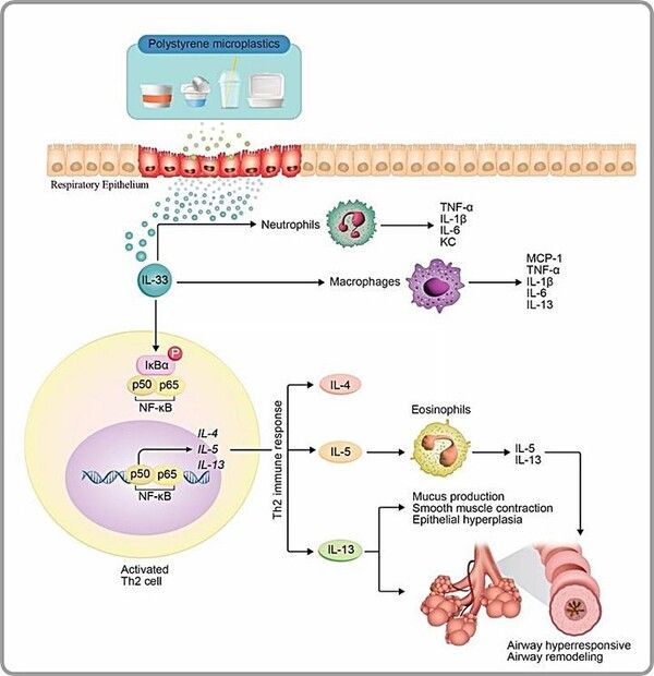 이를 통해 PS 미세플라스틱에 노출된 상피가 손상되면서 IL-33 단백질이 분비되고 천식 증상과 기도 염증이 유발되는 과정을 과학적으로 증명했다.