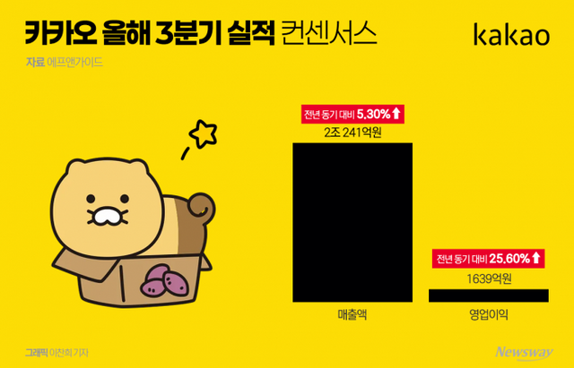 22일 금융정보업체 에프앤가이드에 따르면, 카카오의 올해 3분기 실적 컨센서스(증권사 전망치 평균)는 매출 2조241억원, 영업이익 1639억원이다. 지난해 3분기와 비교해 매출은 5.3%, 영업이익은 25.5%나 확대된 수준이다.