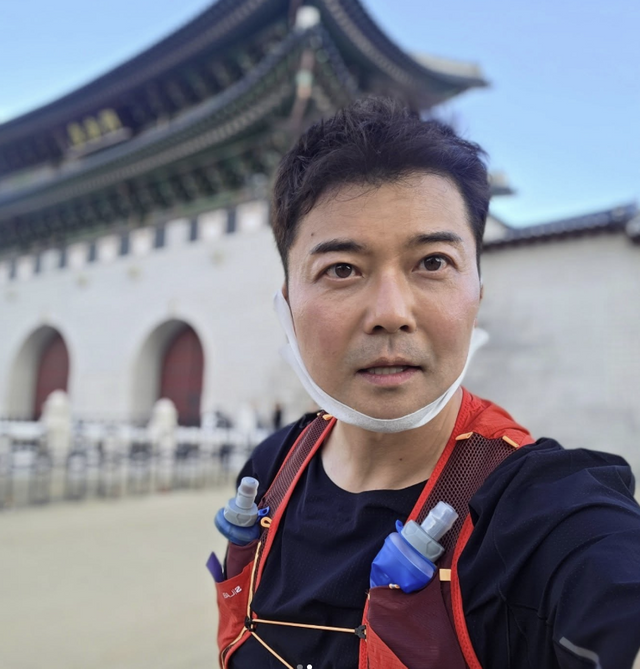 공개된 사진 속 그는 광화문을 배경으로 러닝복 차림에, 수분 보충용 물통이 달린 러닝 베스트를 착용한 채 인증샷을 남기고 있다.