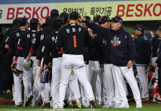 김경문 감독이 PO에서 단행한 승부수는 거의 통했다. 1·3차전 문동주의 구원 투수 기용이 그랬고, 3차전 선발 유격수로 심우준 대신 김도윤을 투입한 것도 맞아떨어졌다. 경기 중엔 좀처럼 직접 조언을 하지 않는데, 3차전 노시환의 3번째 타석을 앞두고는 마치 앞을 내다본 것처럼 딱 좋은 귀띔을 해줬다.