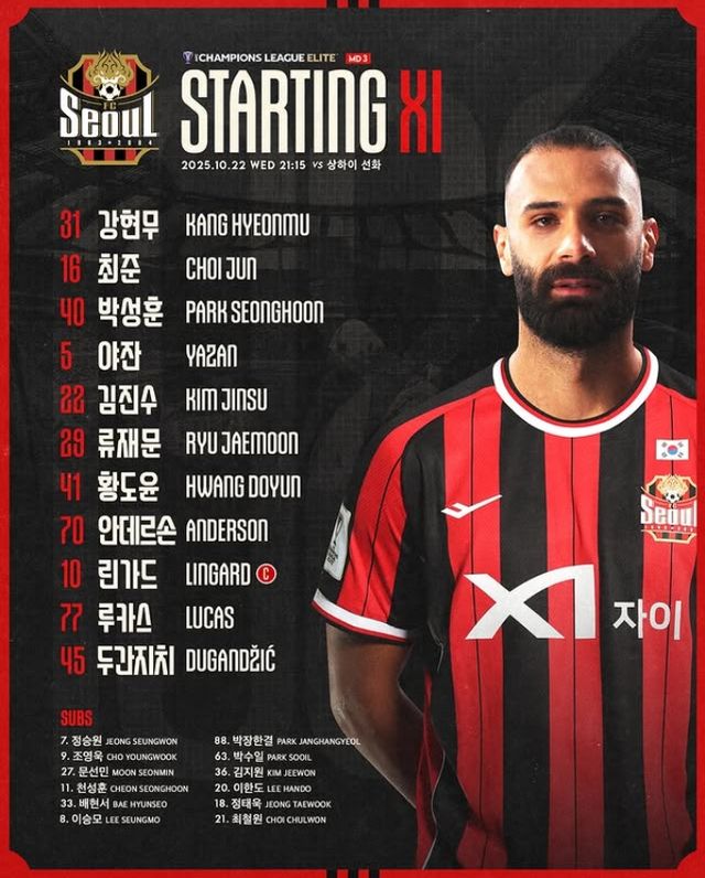 주장 제시 린가드를 비롯해 서울에서 뛰는 외인 선수 5명이 상하이 선화를 상대로 모두 선발 출전해 승리를 노린다.