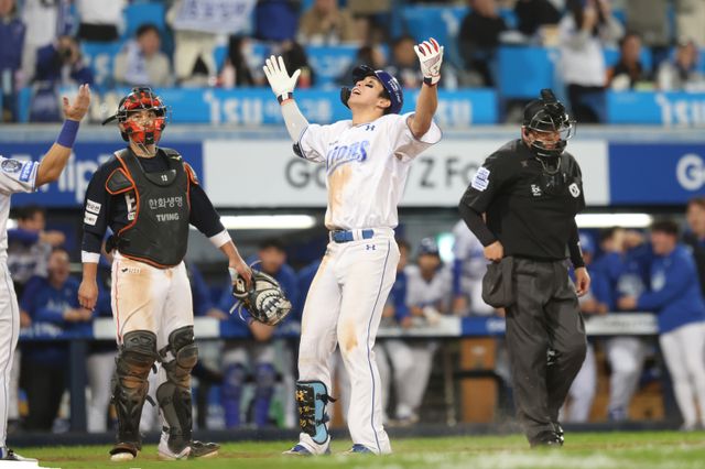 김영웅은 21일 대구 삼성라이온즈파크에서 열린 한화 이글스와의 2025 신한은행 SOL 뱅크 KBO 포스트시즌(PS) 플레이오프(PO·5전3선승제) 4차전에 5번 타자·3루수로 선발 출전, 7회 3점포를 쏘아 올렸다.
