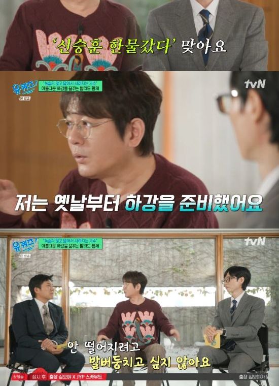 신승훈은 "근데 제가 노래할 수 있는 프로그램이 별로 없다. 아이돌 나오는 프로그램에 제가 출연할 수는 없지 않냐. 그러니까 음악 방송에 출연을 했어도 '요즘 뭐하세요?' 라고 물어보시는거다. 이번에 노래를 할만큼 했었다. 그래서 '유퀴즈' 섭외를 한번에 승낙했다. 행복하다"면서 웃었다.