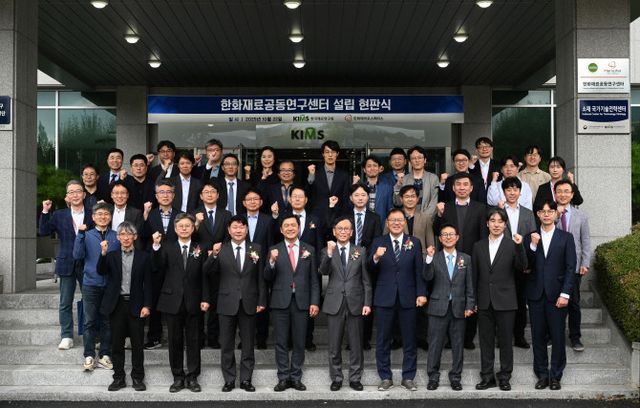 지난 22일 경남 창원 한국재료연구원에서 진행된 '한화재료공동연구센터' 현판식에서 윤삼손 한화에어로스페이스 항공사업부 CTO, 최철진 재료연 원장 등 관계자들이 기념사진을 찍고 있다. ⓒ 한화에어로스페이스