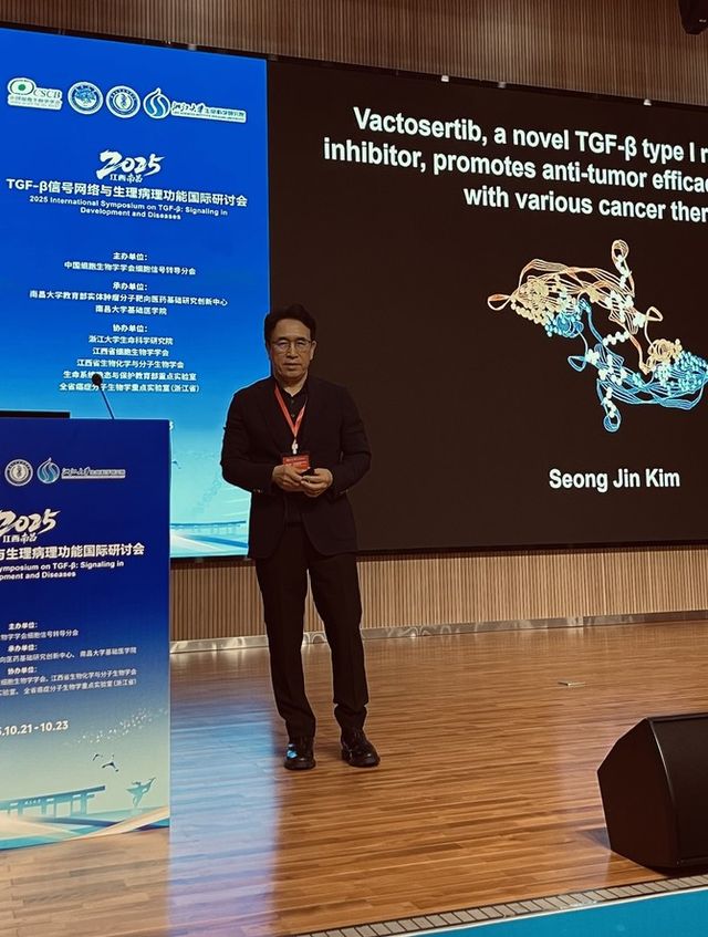 이번 행사에는 TGF-β 분야의 세계적 석학이기도 한 김성진 대표가 주요 연사로 초청받아 '종양 미세환경을 조절하는 TGF-β 억제제의 임상 개발 현황'이라는 주제로 발표했다.