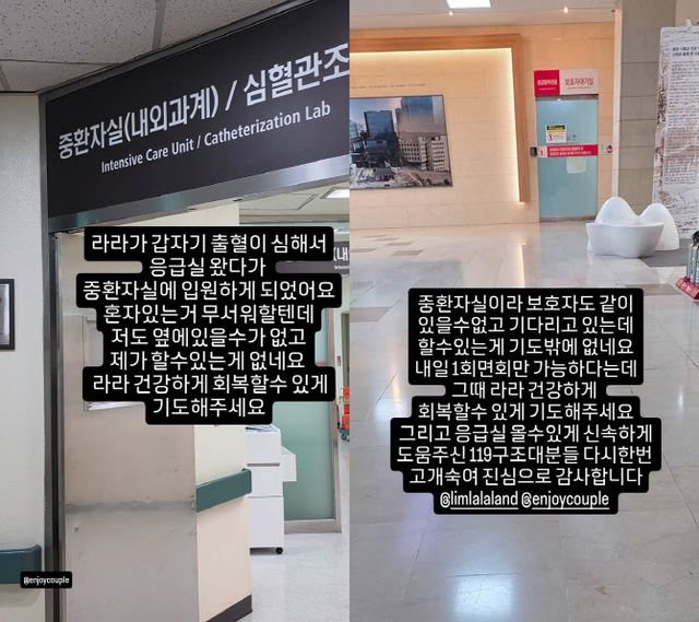 임라라의 남편이자 코미디언인 손민수는 23일 자신의 사회관계망서비스(SNS)를 통해 “라라가 갑자기 출혈이 심해서 응급실 왔다가 중환자실에 입원하게 됐다”고 밝혔다.