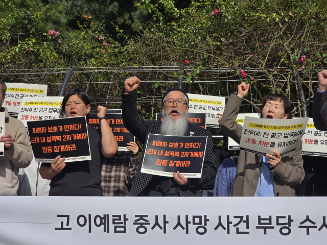 22일 고 이예람 중사의 아버지 이주완 씨와 군인권센터 부설 군성폭력상담소, 전국성폭력상담소협의회는 서울 서초구 서울중앙지방법원 앞에서 기자회견을 열고 "2심 재판부에 전익수의 강등을 유지하는 판결을 강력히 촉구한다"고 밝혔다.