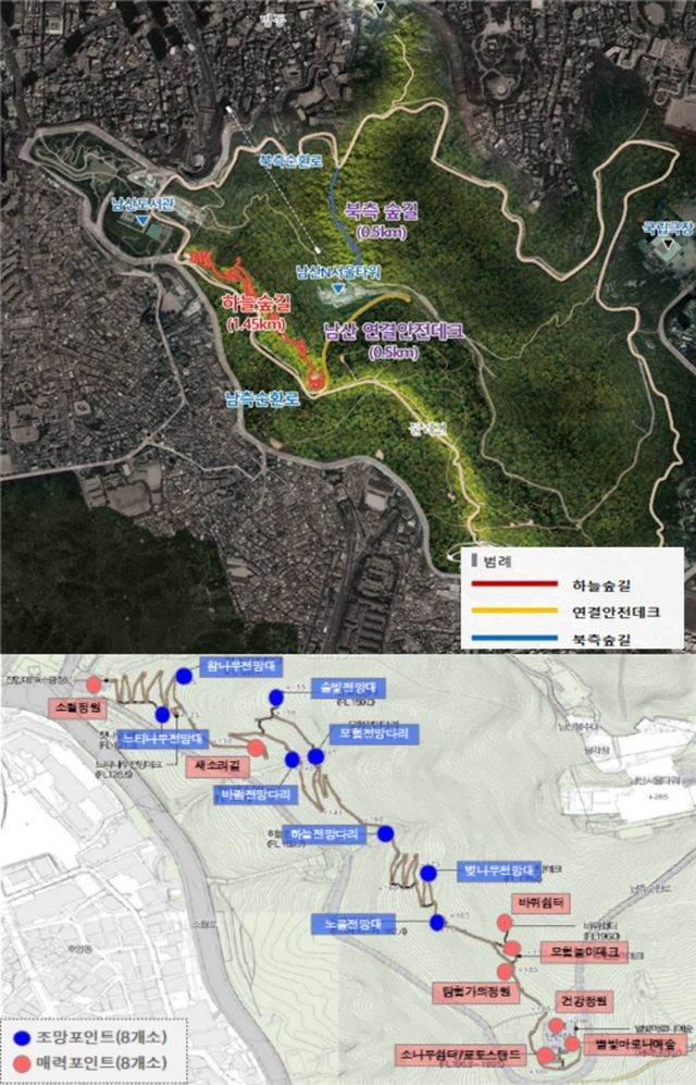 남산 하늘숲길 위치도와 조망 · 매력포인트 위치 / 서울시 제공